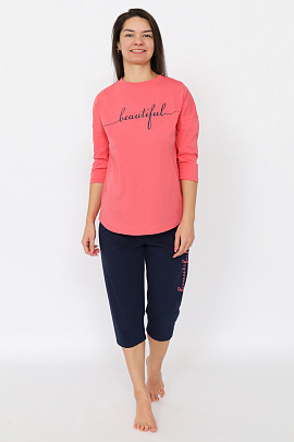 Гладкокрашенная пижама из джемпера и бридж. Джемпер свободного покроя с рукавом 3/4. Горловина обработана притачной бейкой из рибаны с лайкрой. Перед оформлен принтом. Бриджи прямые умеренного объёма длиной ниже колена выполнены из полотна дополнительного цвета. Цельнокроенный пояс обработан плоским швом вподгибку с одновременным прокладыванием резинки. На левой стороне - принт.