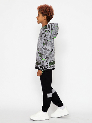 Брюки с притачным поясом и манжетами. В пояс вставлена резинка и функциональный шнур. Пояс и манжеты выполнены из полотна с эластаном. В боковой части брюк располагаются карманы. На передней части в области колена расположен декоративный подрез. На задней части брюк расположена декоративная вставка контрастного цвета. Карман декорирован вязаной нашивкой.