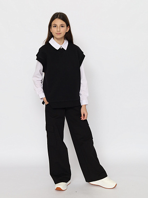 Модные брюки-карго с накладными карманами подойдут в качестве школьной формы, а также повседневной одежды. Изготовлены из футера. Свободный силуэт и пояс на резинке не стесняют движений. Брюки имеют карманы достаточной глубины.