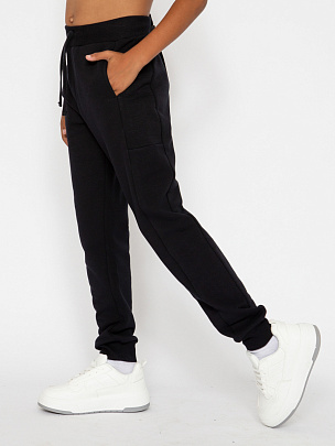 Свободные трикотажные брюки из плотного футера без начеса с карманами. Пояс притачной с резинкой и функциональным шнуром. По низу брюки собраны на резинку.